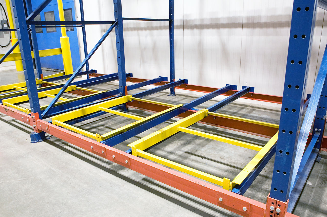 Sistema de almacenaje por acumulación que permite almacenar hasta cuatro tarimas en fondo por cada nivel. Todas las tarimas de un mismo nivel, a excepción de la última, se asientan sobre un conjunto de carros que se desplazan, por empuje, sobre los rieles de rodadura.